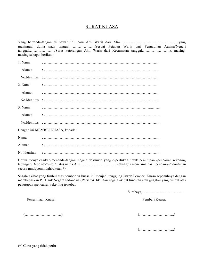 Ini contoh surat kuasa bank bni, untuk nasabah yang telah meninggal dunia. Surat keterangan ahli waris dari kecamatan tanggal. Surat gugatan dibuat 7 rangkap untuk majelis hakim, 1 rangkap untuk pp, 1. Asli surat pernyataan ahli waris standar bank* Surat ini dibutuhkan untuk melengkapi .